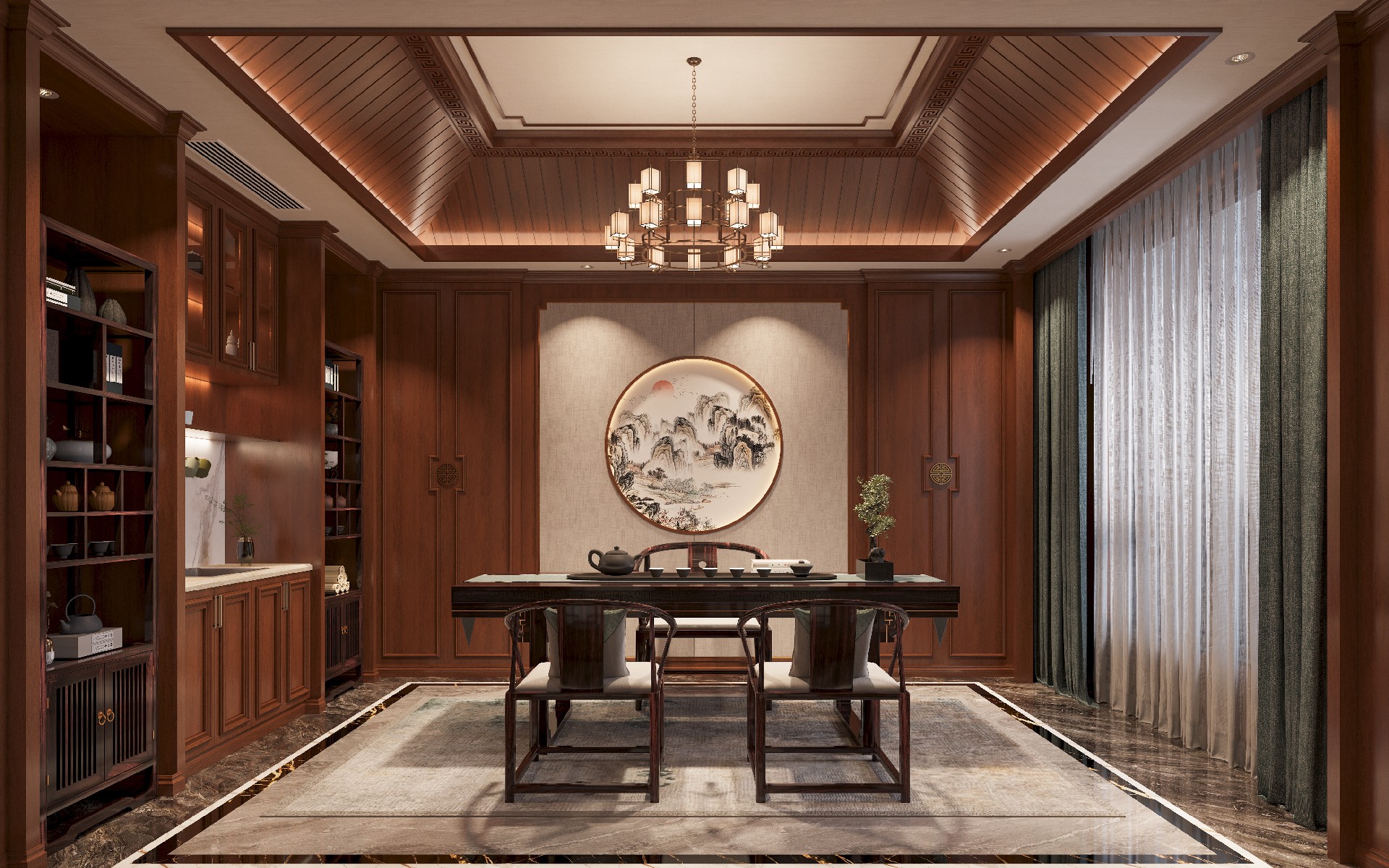 整面墻的TSCN(托斯卡納)美裝家黃花梨木墻板與絲織駝墻板從墻面直抵穹頂,木材自然的棕紅色澤在頂燈映照下,