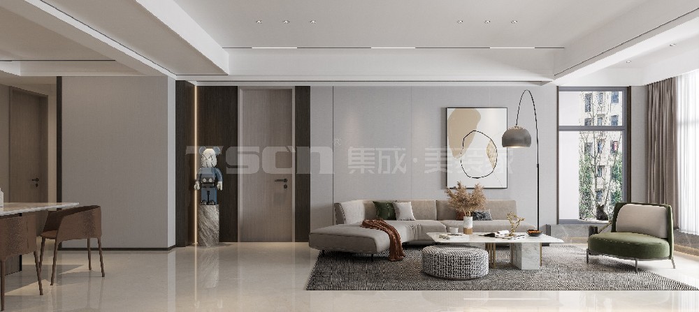 現代極簡風格——本案以淺中性色為主色調,輔以灰調煙熏木色,深淺對比,明暗有度。極簡風格設計主張少而實用,從風格設計到家具選擇整套流程皆遵循功能性原則,利用簡單的布局,極具格調的細節修飾,簡單卻又不匱乏地滿足了人們日常活動所需。